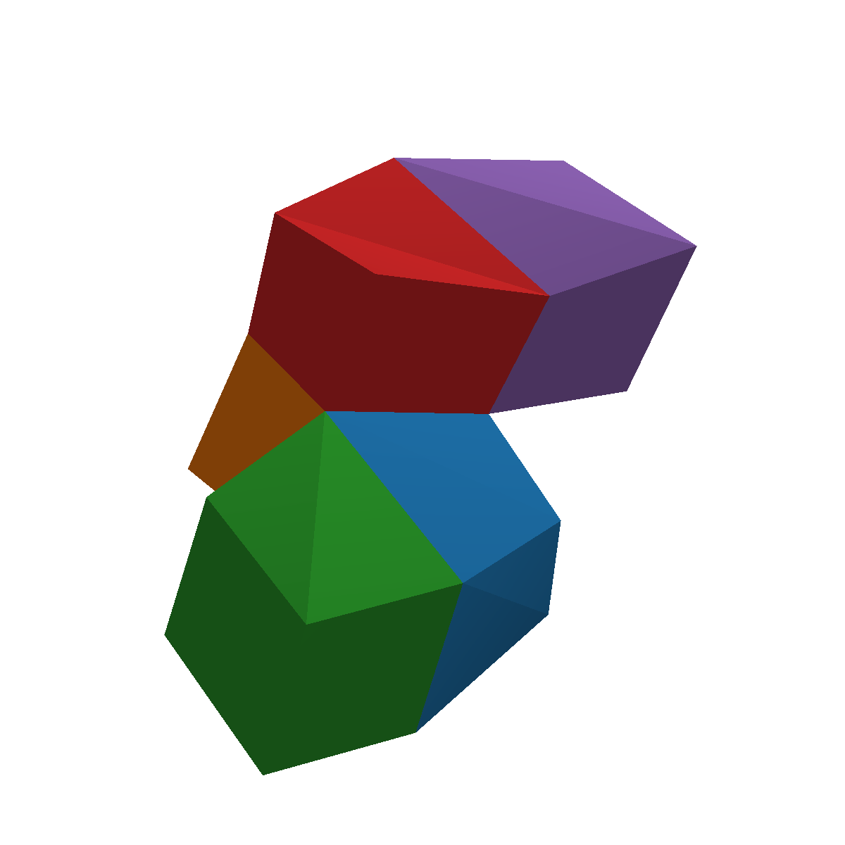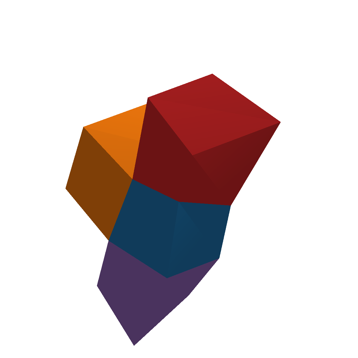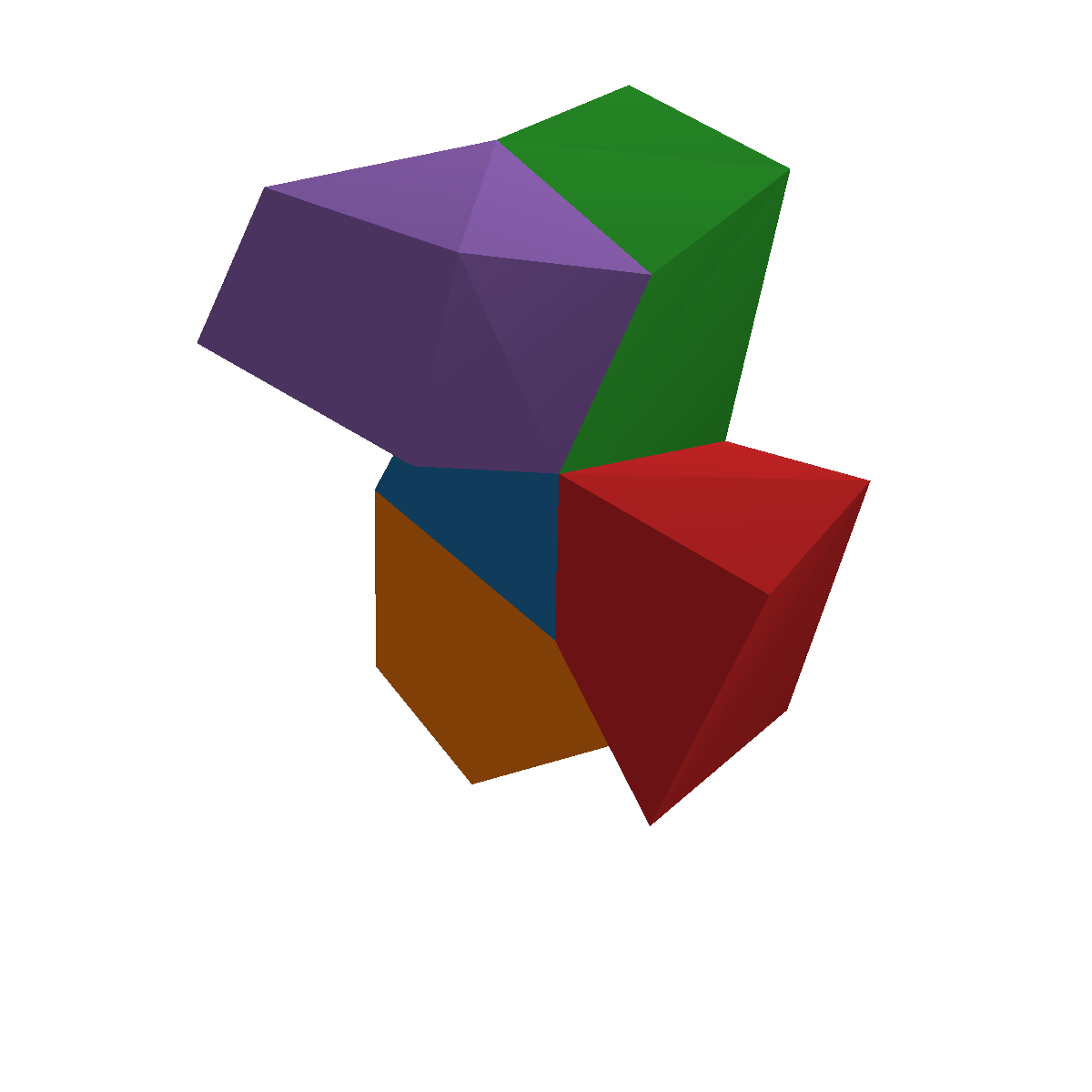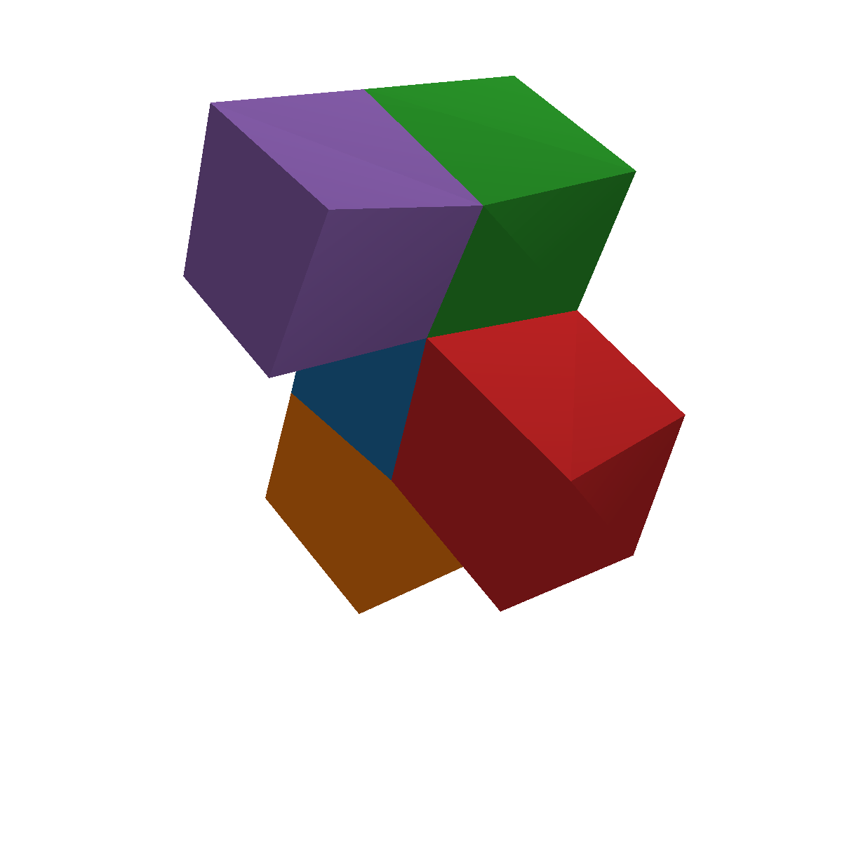The figure below shows three sample polycubes (rows) of order five. Each shape is randomly deformed, by four increasing amounts (columns):