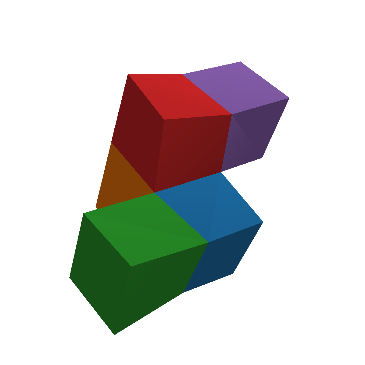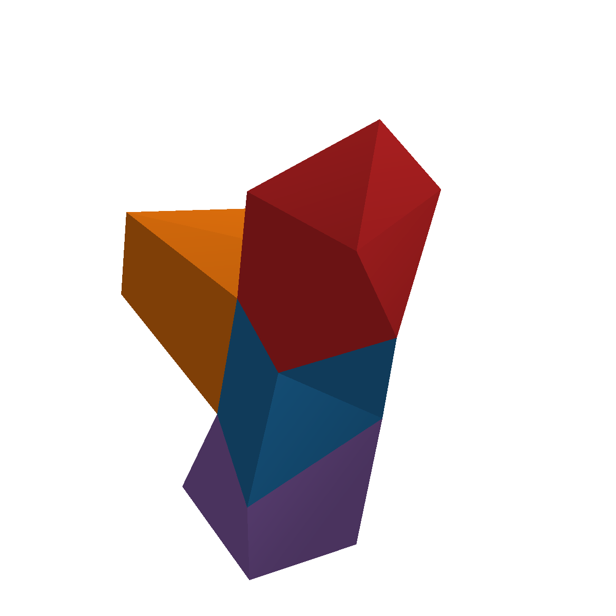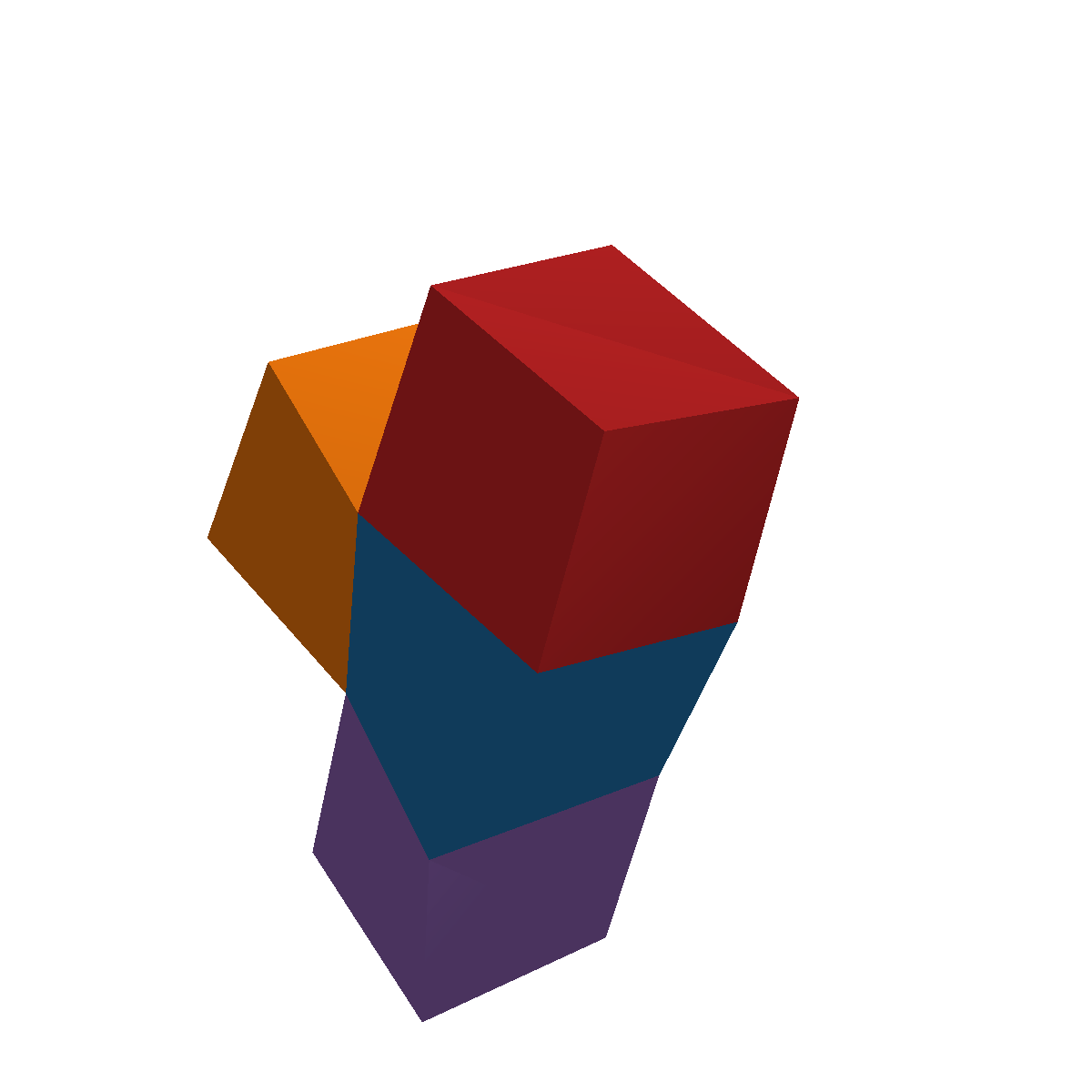 The figure below shows three sample polycubes (rows) of order five. Each shape is randomly deformed, by four increasing amounts (columns):